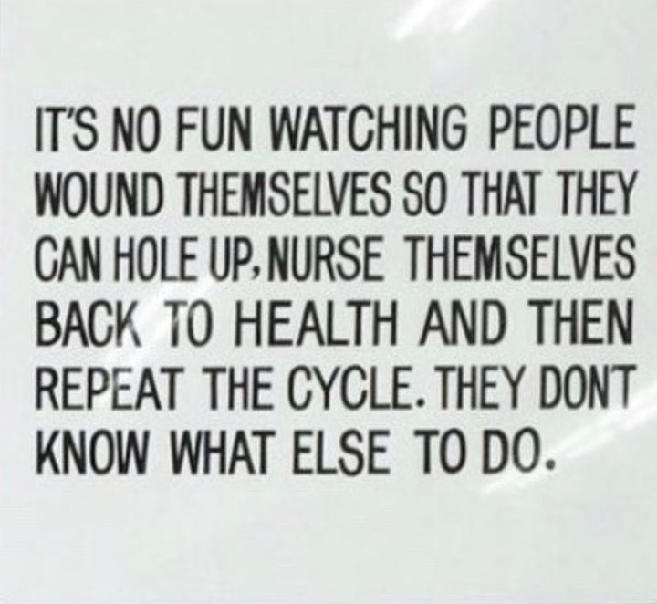 Earlier this year, the Jenny Holzer quote about people wounding themselves because they don’t know what else to do became my anti-mantra. I think it’s a brutally succinct quote, and reading it helped me understand the cycle I was trapped in more thoroughly.
